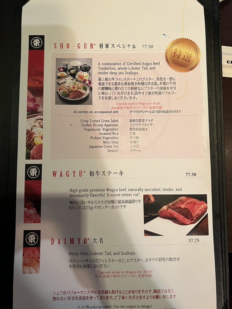 Enjoy a vibrant atmosphere perfect for families and groups, complete with waiter service and an outdoor seating area. Highlights include the lively show put on by chefs, who not only cook to perfection but also engage diners with their flair. Customer favorites like the lobster and fried rice dazzled palates with their smoky flavor and quality. Whether you're craving a hearty meal or a fun night out, Tanaka of Tokyo Central promises a memorable experience.